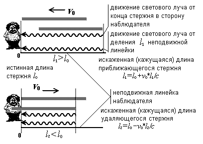 Когда в процессе эксперимента начало движущегося стержня поравняется с началом шкалы неподвижной линейки, то находящийся в том же начале шкалы наблюдатель увидит другой конец стержня не напротив деления L0 неподвижной линейки, а напротив того деления L1 > L0, изображение которого принес световой луч со скоростью с в тот момент, когда начало стержня поравнялось с началом шкалы линейки, т.е. с запозданием на L1/c (см.рис.1).