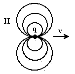 В случае одиночного движущегося точечного заряда, его электрическое поле Е0 имеет сферическую симметрию, а магнитное поле В = (v х Е0)/с2, пропорционально синусу угла между v и E0, так что на самой линии движения оно равно нулю.